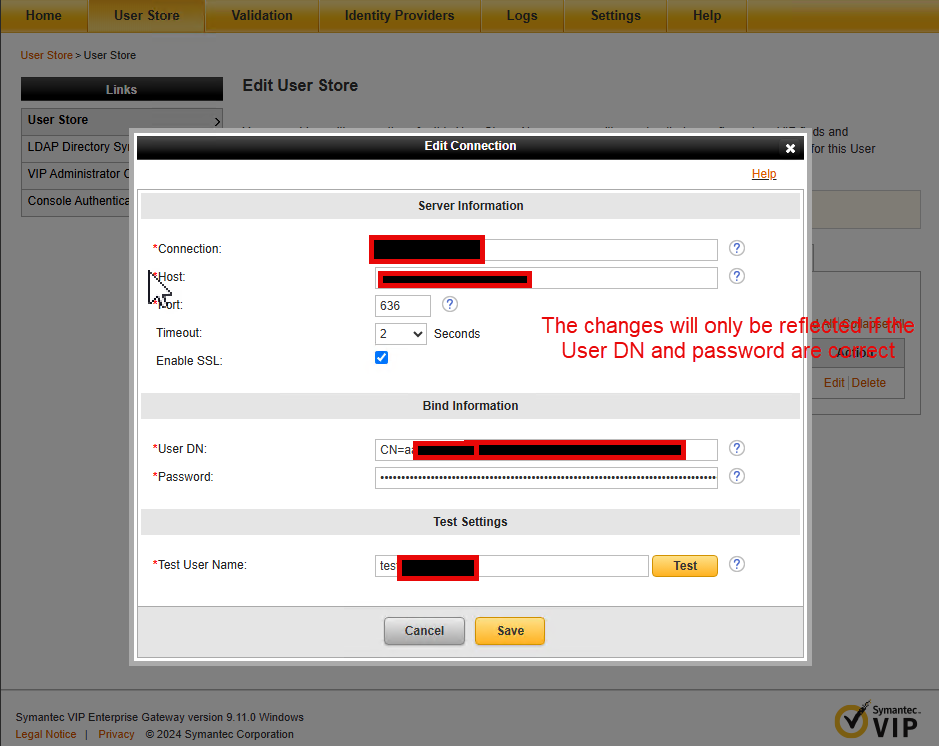 In the VIP Enterprise gateway(EG) , When updating the User Store binding account credentials in the console, the changes are not retained. After saving the connection details, the binding credentials revert to their original values instead of reflecting the updated information.