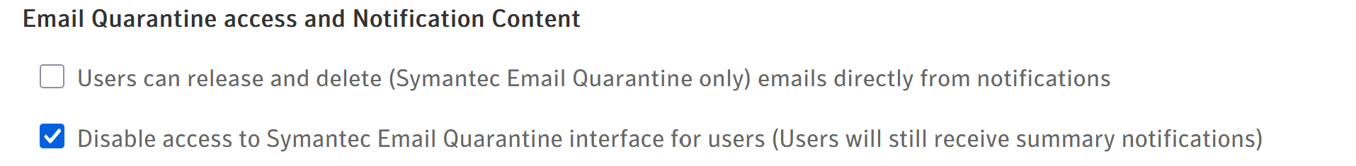 2 - Uncheck the option Disable access to Symantec Email Quarantine interface for users under Email Quarantine access and Notification Content.