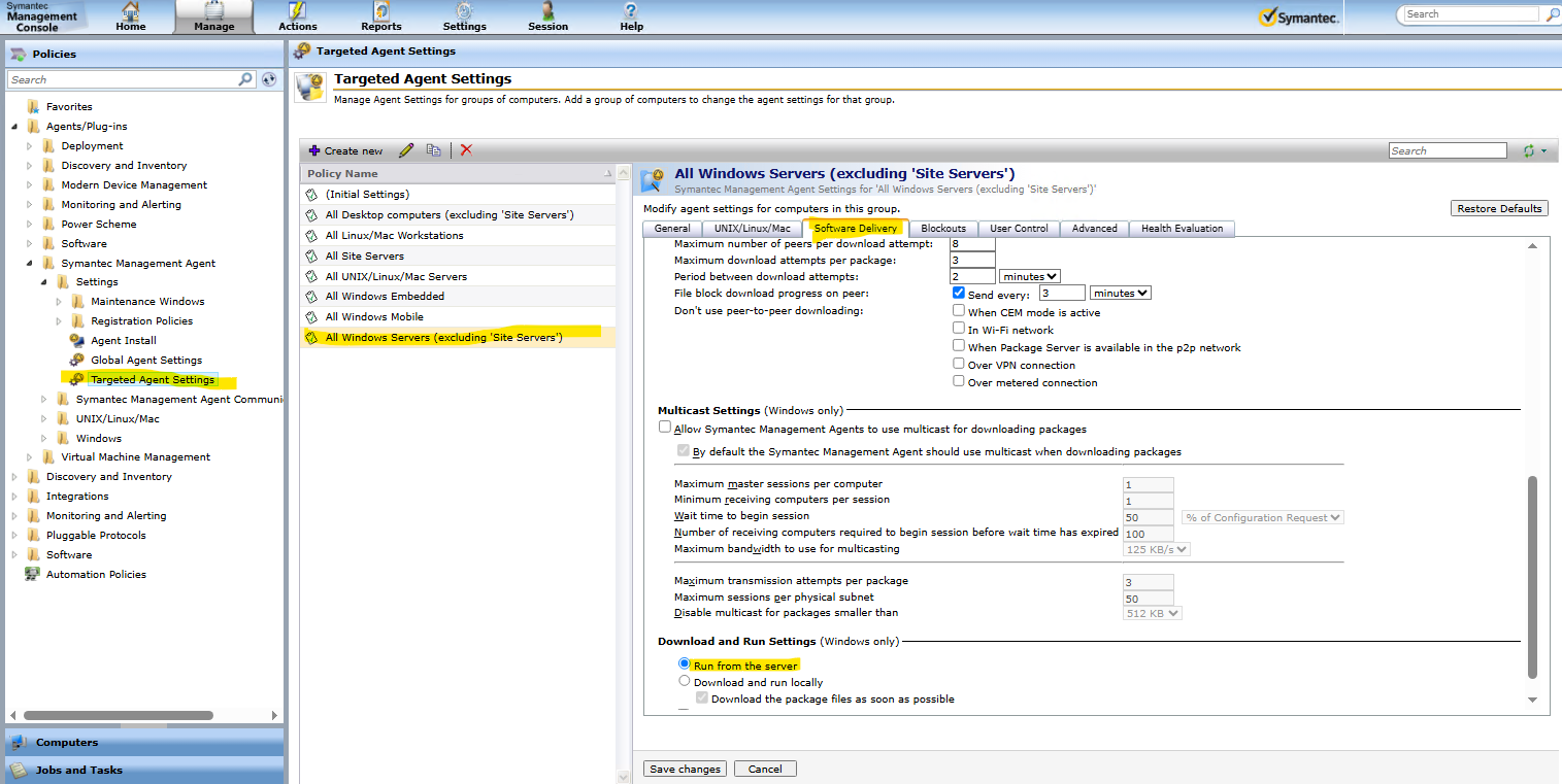 Targeted Agent Settings policy for All Windows Servers (excluding 'Site Servers') was configured to run software deliveries from the server instead of the default, download and run locally.