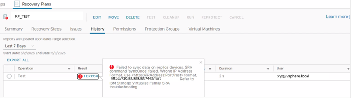 SRA command 'discoverDevices' failed. Wrong IP Address Format, use https://IPAddress:Port/rest format. Example https://10.##.###.##:7443/rest. Refer to IBM Storage Virtualize Family SRA troubleshooting.