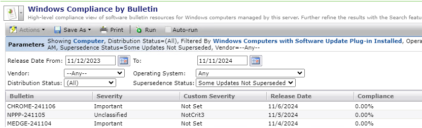 - Yet then if you go into another report - Compliance By Bulletin (which does not have this custom severity parameter configurable):