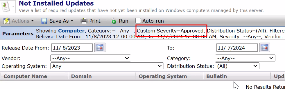 - Then if you go into any sub-reports (drill-down) and select Applicable, or Not Installed, etc - the custom severity parameter is pre-configured (which seems to be expected - as it's also visible as configure-able).