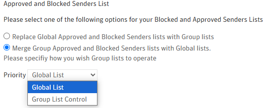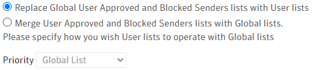 You are facing the situation where the Priority drop-down list is not editable in 'Merge User Approved and Blocked Senders lists with Global lists' or 'Merge Group Approved and Blocked Senders lists with Global lists'