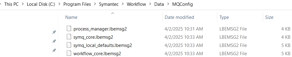 WF Service (Logicbase Server extenstions) manages self-configuration in folder "C:\Program Files\Symantec\Workflow\Data\MQConfig" in .lbemsg2 files