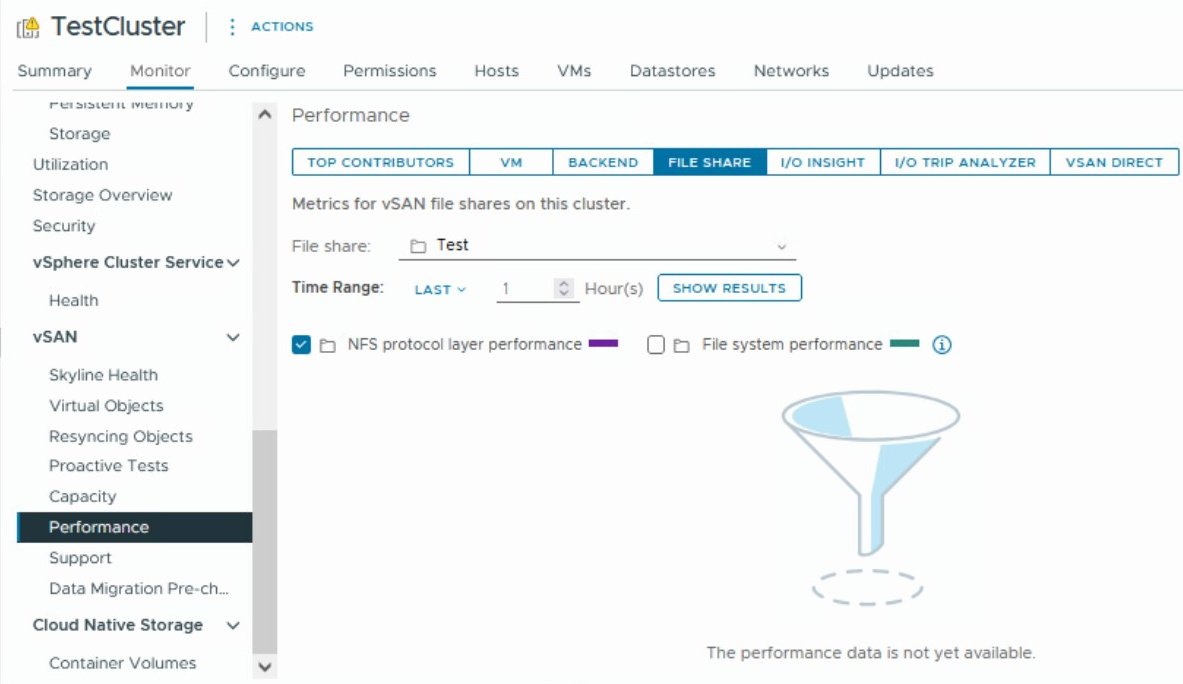 In vCenter, navigating to vSAN-Cluster-->Monitor-->vSAN-->Performance-->FILE SHARE-->File_Share_Name-->SHOW RESULTS, may not display performance metrics for some vSAN File Shares while it does for others.