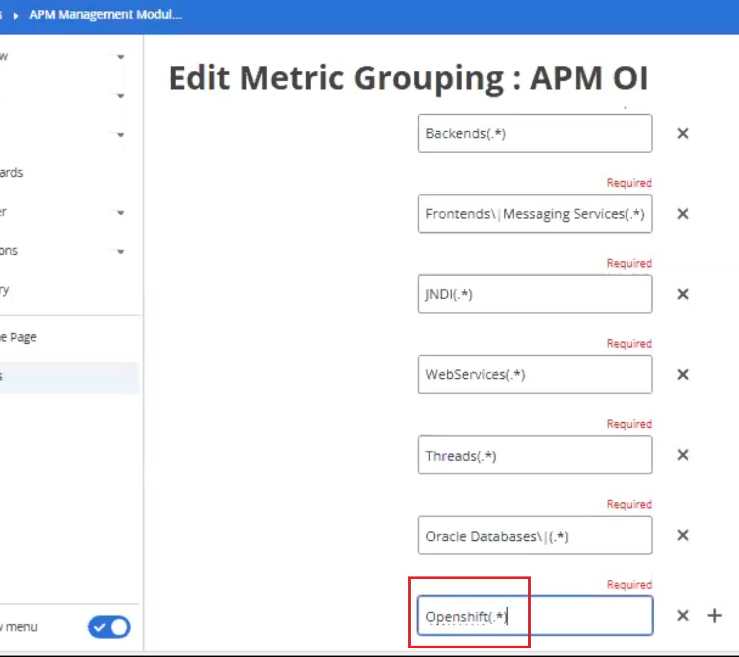 The default "APM OI" metric grouping is missing the Openshift regexp: Openshift(.*) added post Tenant creation as per of a recent release