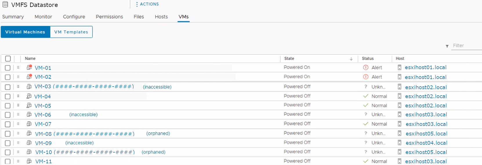"/var/run/log/vobd.log", we see below entries -2025-05-03T19:45:17.344Z: [scsiCorrelator] 5679137454718us: [esx.problem.scsi.device.state.permanentloss] Device: eui.################################ has been removed or is permanently inaccessible. Affected datastores (if any): Unknown.