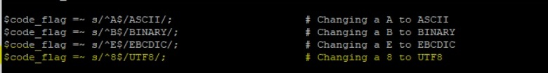 The post-processing script was corrected to handle the value of '8' and CODE=UTF8 was then used for both transfers.
