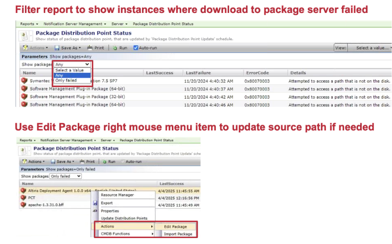 The "Package Distribution Point Status" report is available under "SMP Console > Settings > Notification Server Management > Server" reports folder to simplify the troubleshooting of package failures.