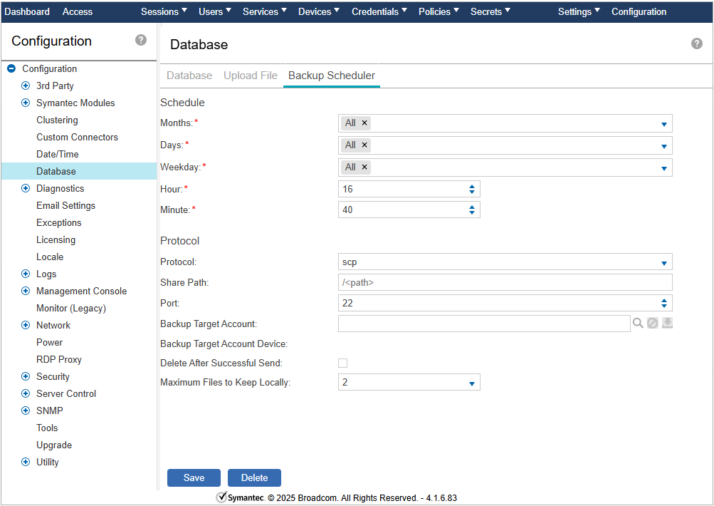 To have the database scheduler automatically delete the backups, use the Schedule a Backup of the Database documentation page to configure PAM to send the database backups to a remote storage, then enable the "Delete After Successful Send" option and set the number of files for the "Maximum Files To Keep Locally" setting.