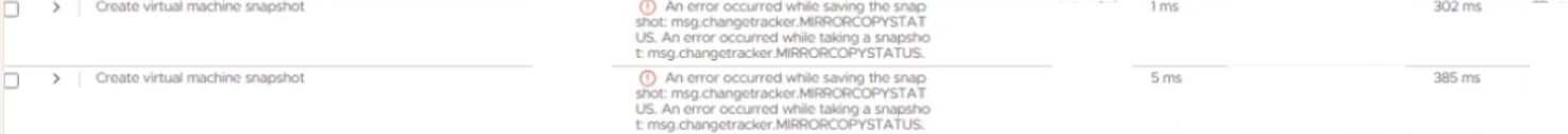 /var/log/hostd.log) shows failure during the transition to the snapshot state:YYYY-MM-DDTHH:MM:SS In(166) Hostd[####]: [Originator@6876 sub=Vmsvc.vm:/vmfs/volumes/vsan:5284a75########-#####/#######-5eb0-###-1c4e-#####/###.###-####.###.vmx opID=###-c5-4f9d sid=52b8626f user=vpxuser:VSPHERE.LOCAL\###] State Transition (VM_STATE_ON -> VM_STATE_CREATE_SNAPSHOT)YYYY-MM-DDTHH:MM:SS Db(167) Hostd[####]: [Originator@6876 sub=Vigor.Vmsvc.vm:/vmfs/volumes/vsan:#####-545b21db########/#####-5eb0-99df-1c4e-######/####.tr-###.####.vmx] Create Snapshot message: An error occurred while saving the snapshot: Could not get mirror copy status.YYYY-MM-DDTHH:MM:SS Db(167) Hostd[####]: --> An error occurred while taking a snapshot: Could not get mirror copy status./vmfs/volumes/datastore/vm-name/vmware.log)shows the process failed because a disk lock was lost:YYYY-MM-DDTHH:MM:SS Wa(03) vmx - DISKLIB-CBT : ChangeTrackerESX_GetMirrorCopyProgress: Failed to copy mirror: Lost previously held disk lockYYYY-MM-DDTHH:MM:SS In(05) vmx - DISKLIB-LIB_BLOCKTRACK : DiskLibBlockTrackMirrorProgress: Failed to get mirror status of block track info file /vmfs/volumes/vsan:######-545b21d#######/#####-99df-1c4e-#####/###.tr-####.r###_1-###.vmdk.YYYY-MM-DDTHH:MM:SS In(05) vmx - DISKLIB-CBT : ChangeTrackerESX_DestroyMirror: Destroyed mirror node 5###-26#####c-cbtmirror. SrcFd: /vmfs/volumes/vsan:######-545b21#######/#####-5eb0-99df-1c4e-######/te@####n.tr-####.####_1-#####.vmdk, DestFd: /vmfs/volumes/vsan:#####-######7b57/######-####-#####/####.tr#####YYYY-MM-DDTHH:MM:SS In(05) vmx - SNAPSHOT: SnapshotPrepareTakeDoneCB: Failed to prepare block track.YYYY-MM-DDTHH:MM:SS Wa(03) vmx - DISKLIB-CBT : ChangeTrackerESX_GetMirrorCopyProgress: Failed to copy mirror: Lost previously held disk lockThis issue is caused by a file lock conflict related to the Changed Block Tracking (CBT) mirror status. Primary triggers include: