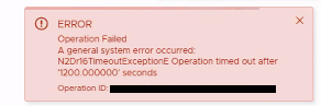 An administrator receives the error "Operation Failed : A general system error occurred: N2Dr16TimeoutExceptionE Operation timed out after '1200.000000' seconds while performing reconfiguration." in SRM VAMI