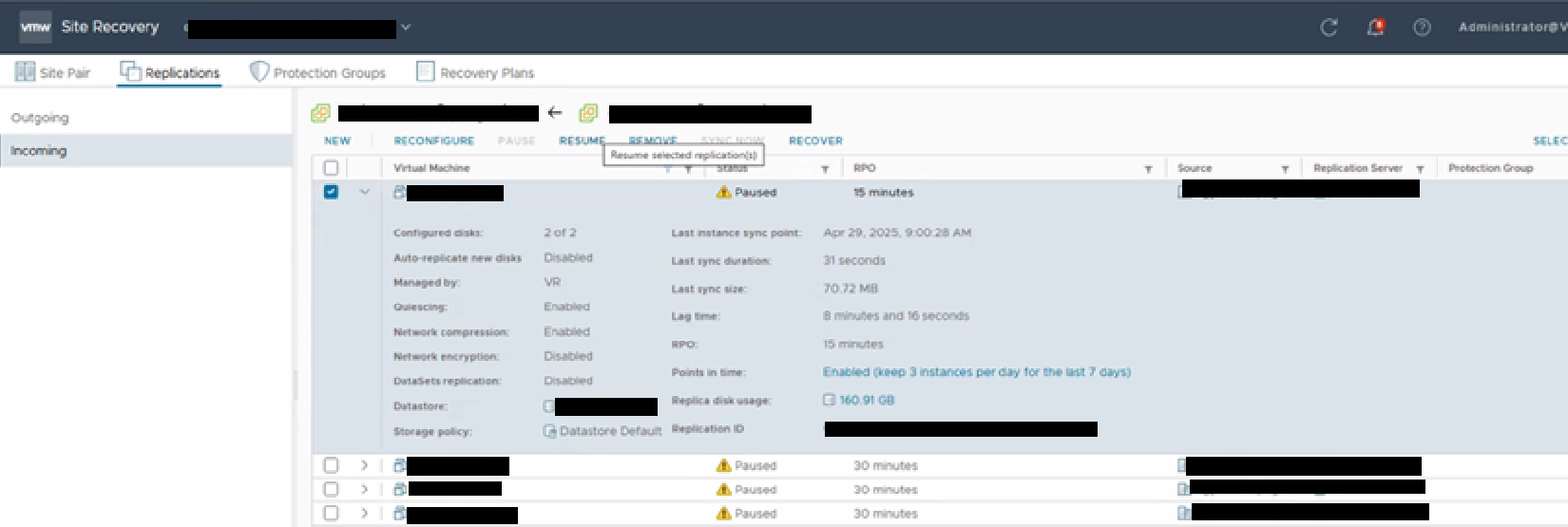 Incorrect replication status is being reported for both inbound and outbound replications across the source and target sites.