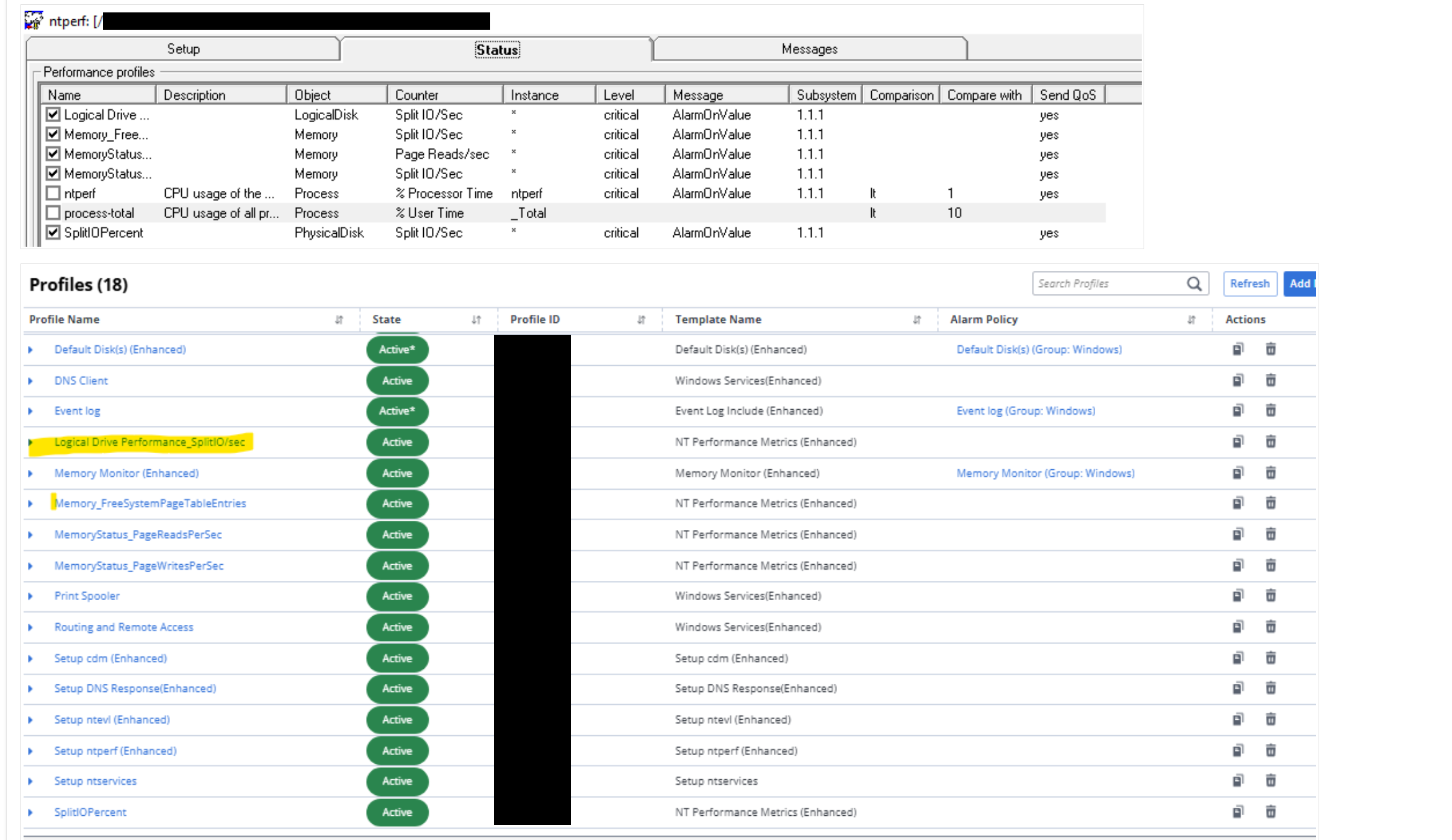The Profile Name given is "Logical Drive Performance_SplitIO/sec" which is displayed correctly in plugin_metric.cfg but displayed as "Logical Drive Performance_SplitIO#sec" in ntperf.cfg