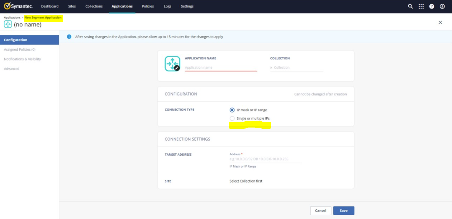When creating ZTNA Segment Application, "Custom domain" option is not available for selection. User sees only "IP mask or IP range" and "Single or multiple IPs"