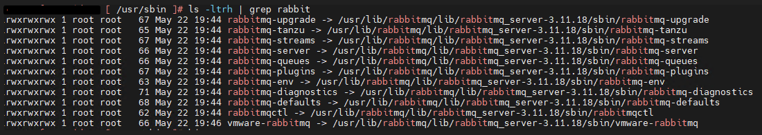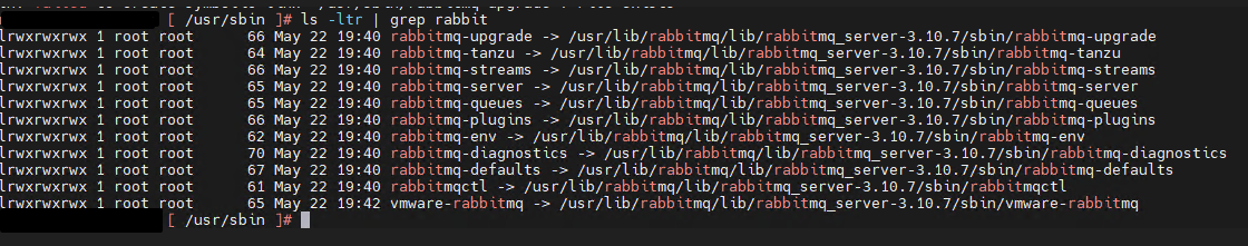 Confirm that the symbolic links in /usr/sbin are now pointing to the latest RabbitMQ version by repeating step 1.