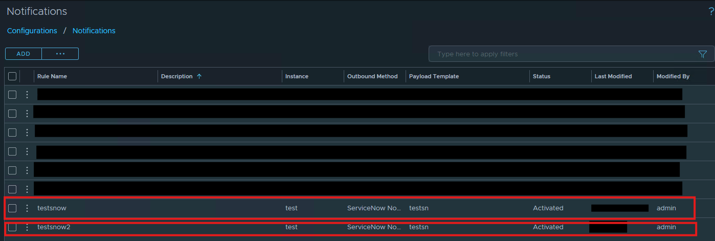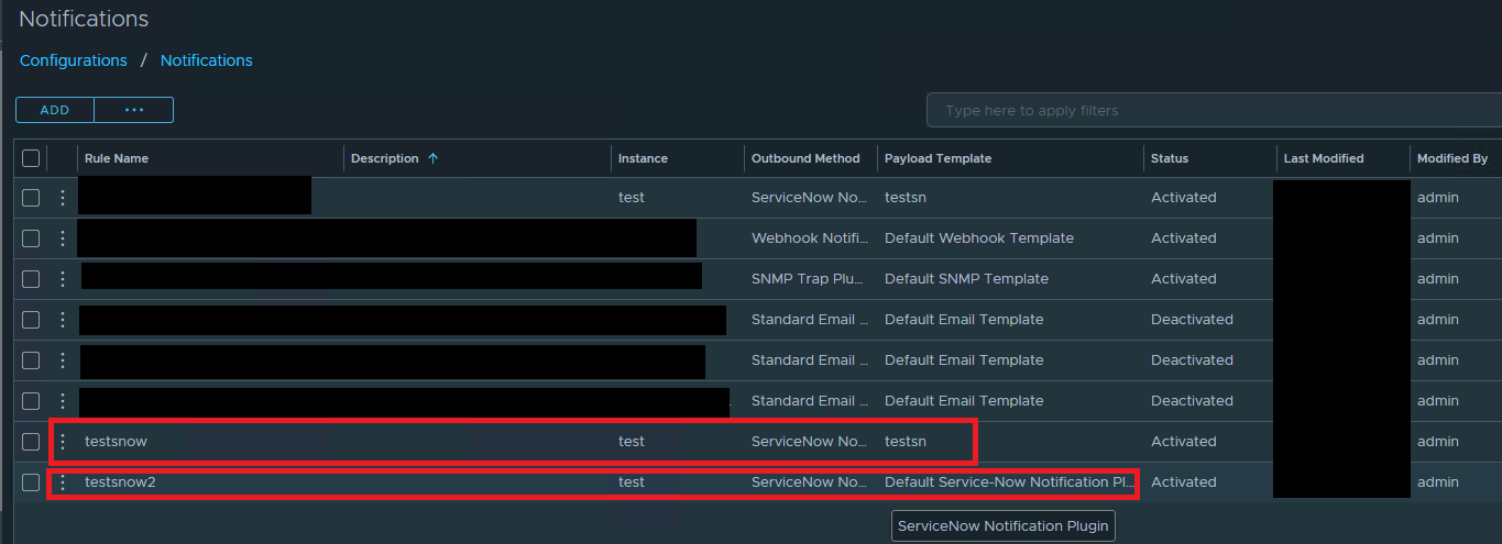 Observe that 'testsnow2' use the 'Default Service-Now Notification Plugin', rather than the custom 'testsn' payload template.