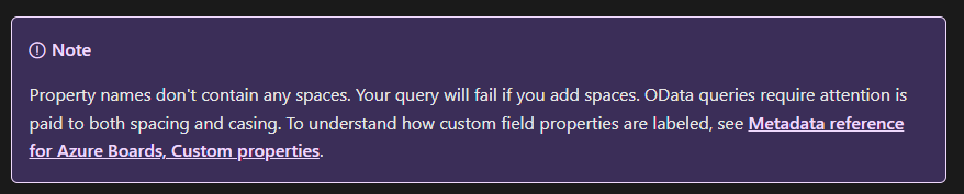 [2] Azure properties OData property names are case sensitive and cannot contain spaces (https://learn.microsoft.com/en-us/azure/devops/report/extend-analytics/wit-analytics?view=azure-devops#return-specific-properties-or-fields)