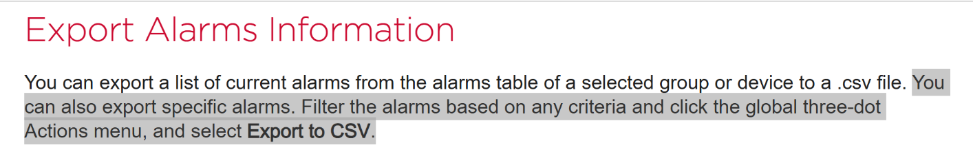 In the OC alarm console if we select a few alarms (example 5 out of 20 alarms) and click "Export to CSV", the list in the CSV will export all 20 alarms instead of the selected 5