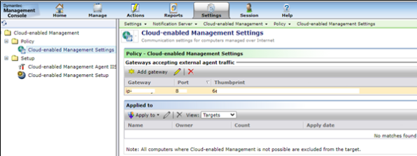 Note: add an additional entry for the gateway by external IP address with the new thumbprint just to make sure that your CEM clients can reach the new Internet Gateway by FQDN and/or IP Address. After the CEM connection has been validated, you can remove the IP Address entry from your Cloud-enabled Management Settings policy if you want.
