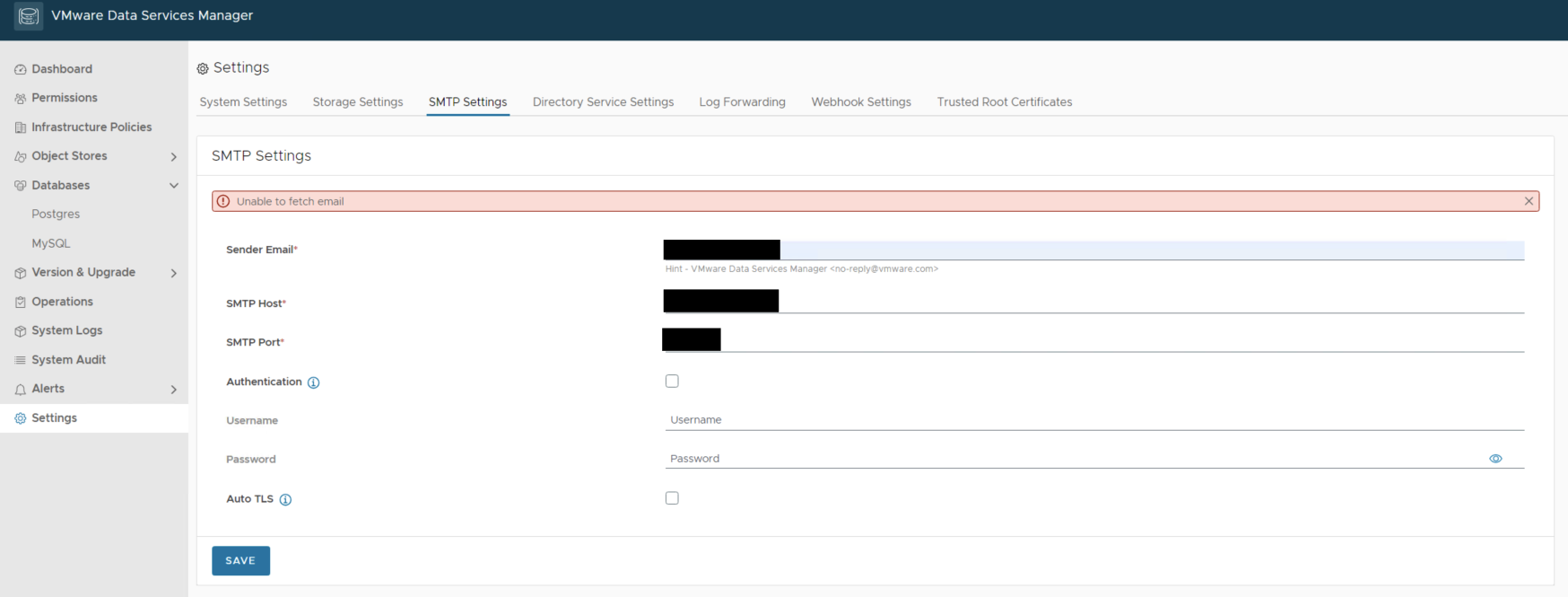 com.vmware.tdm.sp.common.exception.TdmException: Unable to send the test email. Verify the SMTP configuration and try again.