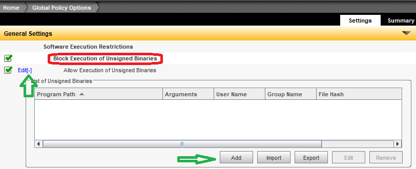 If this option is enabled, and you attempt to launch an unsigned binary additional exception is required in the section below:
