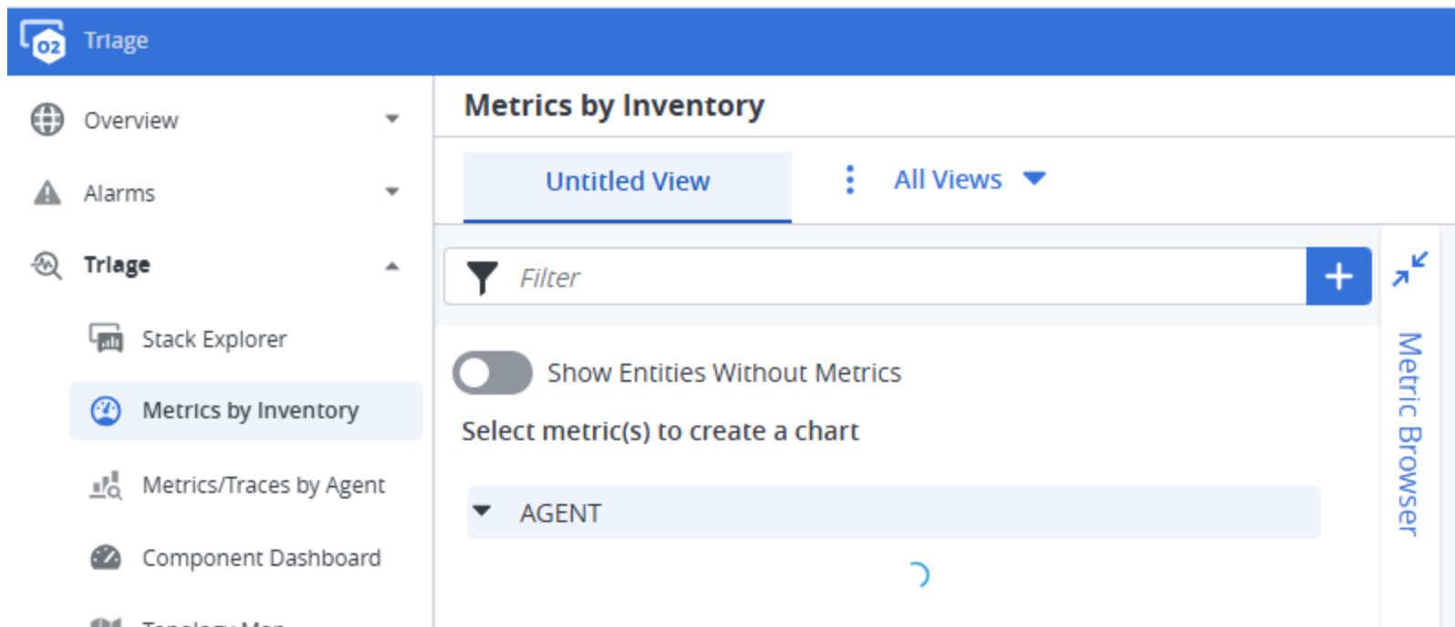 When trying to access 'Metrics by Inventory' , only getting a spinning circle when we click the side triangle by the metric type. We have tried several with same result. See screenshot below of trying to access AGENT.