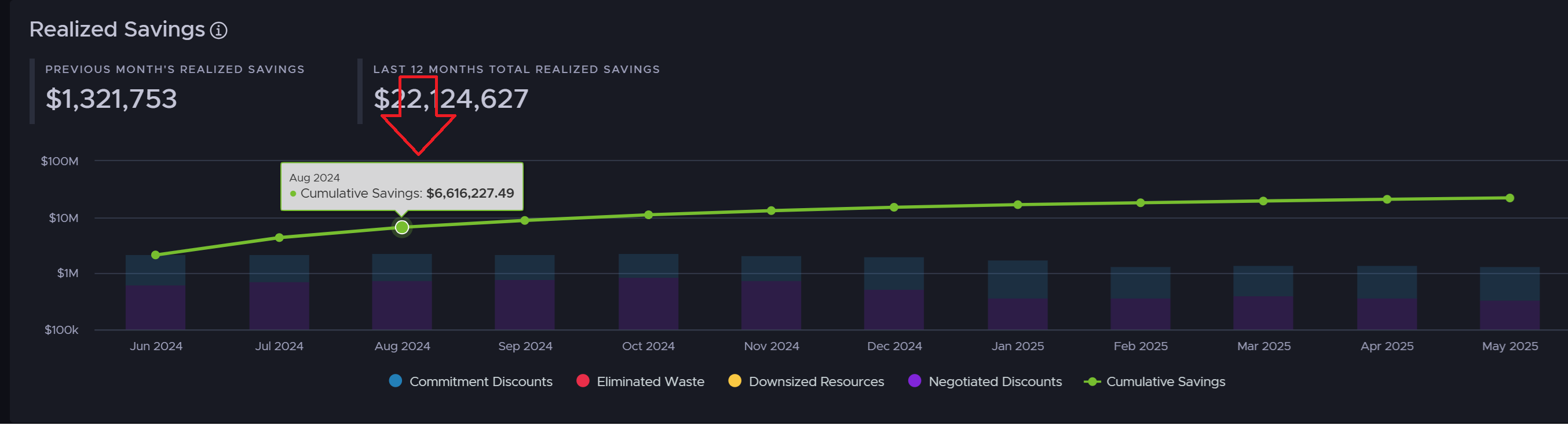 For instance, when you hover over the cumulative savings for Aug-2024, it will display the total savings from Jun-2024, Jul-2024, and Aug-2024. Similarly, when you hover over May-2025, it will show the total savings from the previous 12 months.