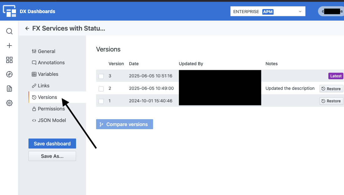 In DX O2, every time a DX Dashboard is modified, a new version is created.