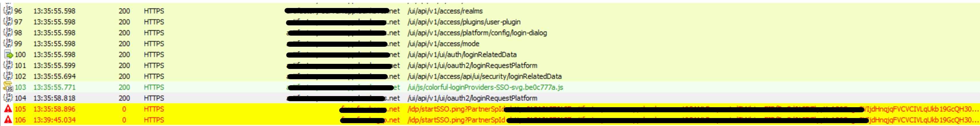 HAR file confirms that failing application main page seems to work, but users never get the expected login page. it requires SSO with an on premise SAML Identity provider seems to fail as shown below: