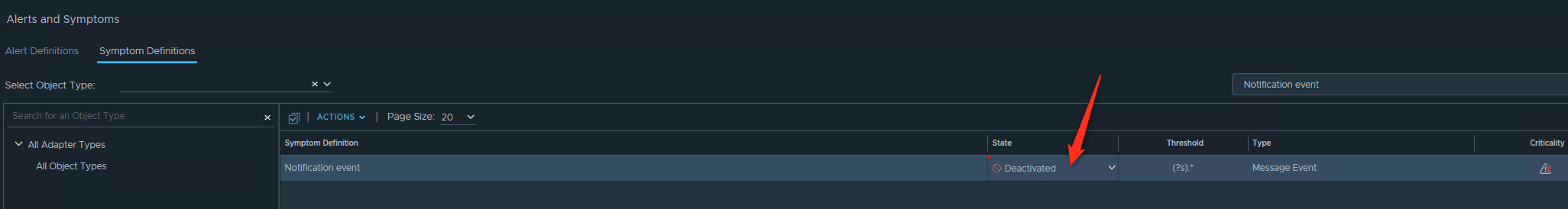 - Select the Symptom definition tab, in the right field type: Notification event, then change the state from Disabled to Activated