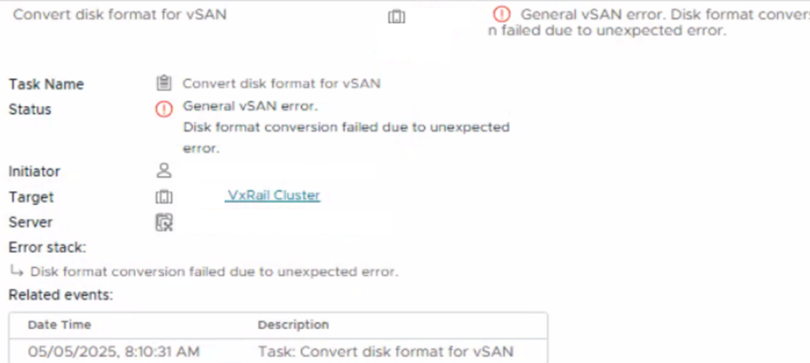 Cluster > Monitor > vSAN > Skyline health.General vSAN error.Disk format conversion failed due to unexpected error.2025-05-14T06:23:52.737Z ERROR vsan-mgmt[1402576] [VsanVcDiskFormatConverterImpl::_Run opID=agw-0115827-5ae9] Disk conversion thread met unexpected errorTraceback (most recent call last): File "bora/vsan/diskmgmt/vpxd/pyMoVsan/VsanVcDiskFormatConverterImpl.py", line 4201, in _Run File "bora/vsan/diskmgmt/vpxd/pyMoVsan/VsanVcDiskFormatConverterImpl.py", line 4956, in ConvertDisks File "bora/vsan/diskmgmt/vpxd/pyMoVsan/VsanVcDiskFormatConverterImpl.py", line 4385, in _RemediateBeforeConversion File "bora/vsan/clustermgmt/vpxd/VsanClusterPrototypeImpl.py", line 1252, in RemediateVsanCluster File "bora/vsan/clustermgmt/vpxd/VsanClusterPrototypeImpl.py", line 1268, in _RemediateVsanCluster2025-05-14T06:23:52.738Z INFO vsan-mgmt[1402576] [VsanVcDiskFormatConverterImpl::_PostConversion opID=agw-0115827-5ae9] Finished dfc for domain-c1065634 result:(vim.cluster.VsanUpgradeStatusEx) {} fault: (vim.fault.VsanFault) { faultMessage = (vmodl.LocalizableMessage) [ (vmodl.LocalizableMessage) { key = 'com.vmware.vsan.diskconversion.msg.internalerror'VMware vSAN (All Versions)