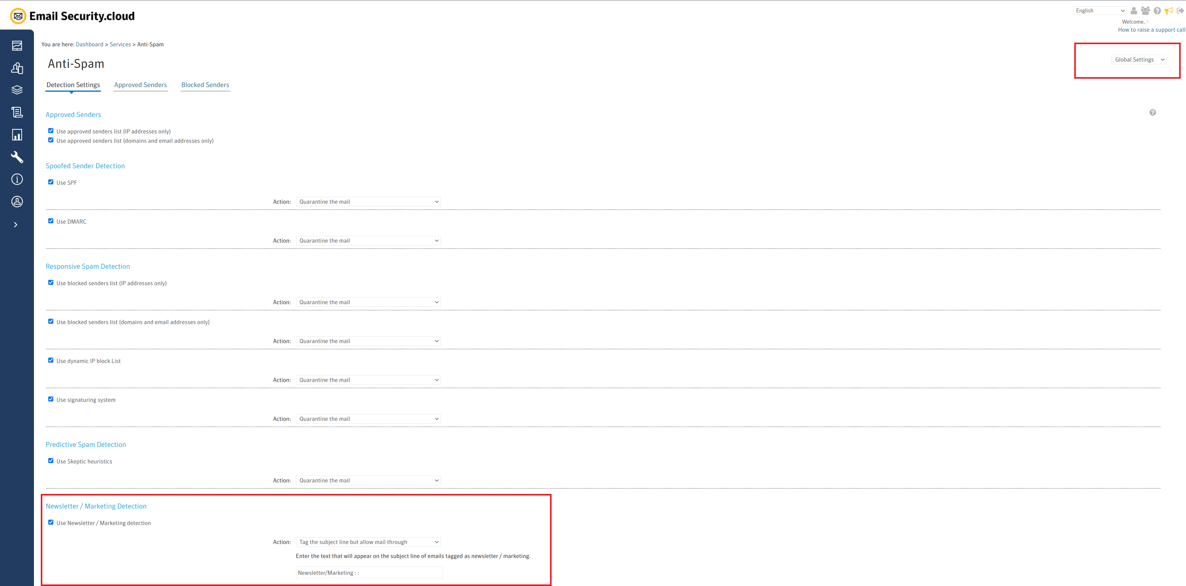 By default, Anti-Spam settings can be applied at either the Global level or at a Custom (domain-specific) level. If a domain is configured to Use Customer Settings, any changes made at the Global level will not apply to that domain.