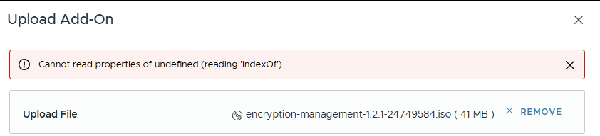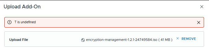 Getting the following error when trying to upload the ISO for Encryption Management 1.2.1 in Cloud Director Solution Add-Ons UI.
