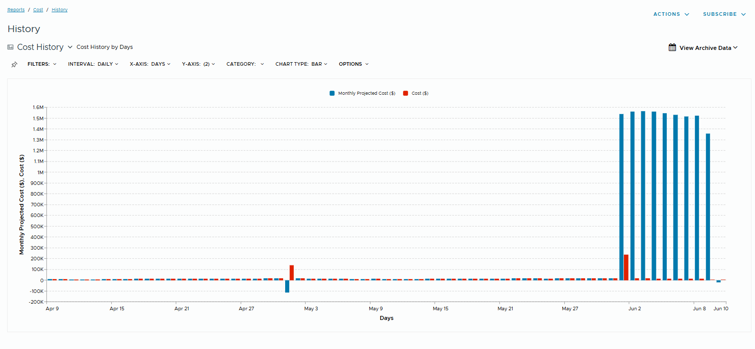 The Projected Monthly Cost measure does not match when looking with a Daily interval selected. Cost for the previous month is in line with the daily cost measure, but is inflated for the current month.
