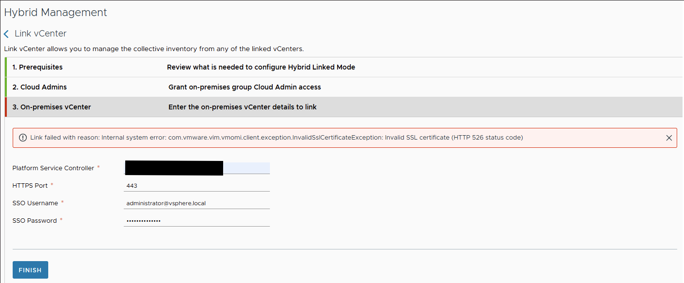 Link failed with reason: Internal system error: com.vmware.vim.vmomi.client.exception.InvalidSslCertificateException: Invalid SSL certificate (HTTP 526 status code)
