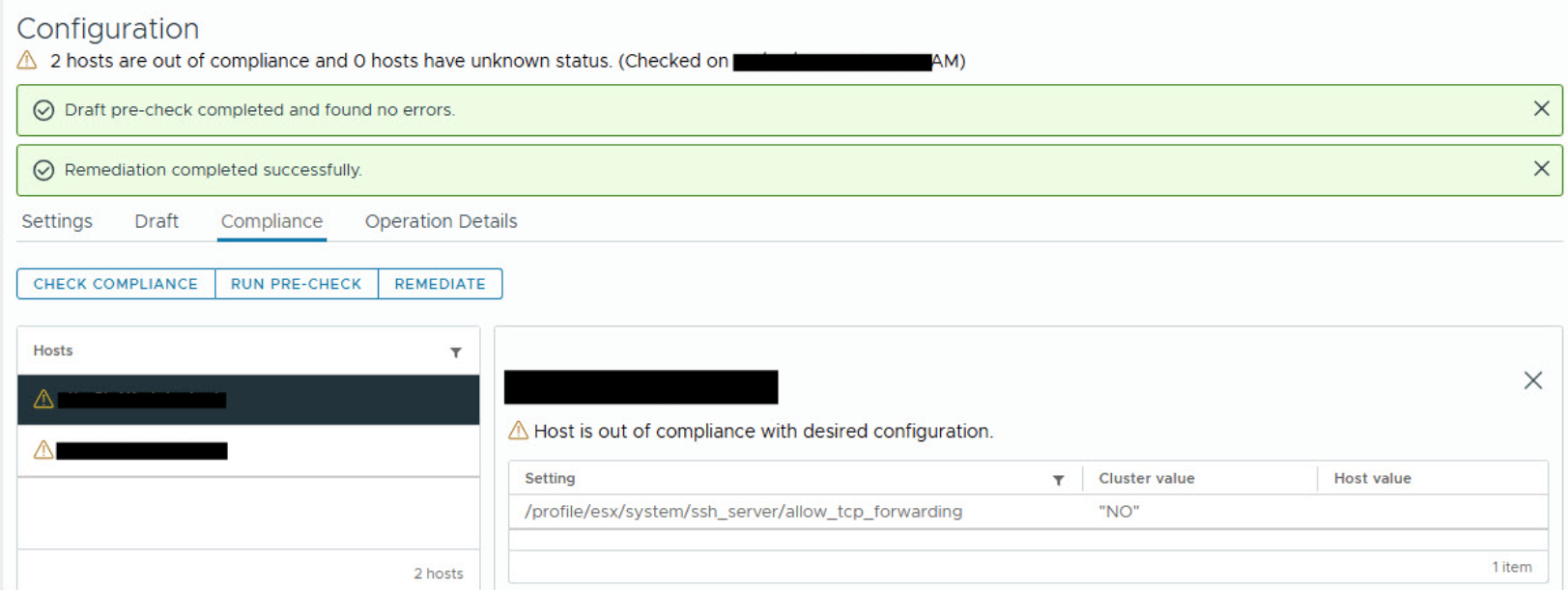 After remediating a configuration profile with "allow_tcp_forwarding" set to "NO", a compliance check will show the ESXi host is not compliant with the configuration profile.