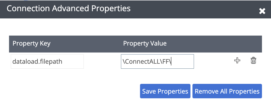 In below screen capture Propety Key refers to the property(dataload.filepath) that ConnectALL will understand if for a Flat File connection and Property Value is the base location on your SFTP server.