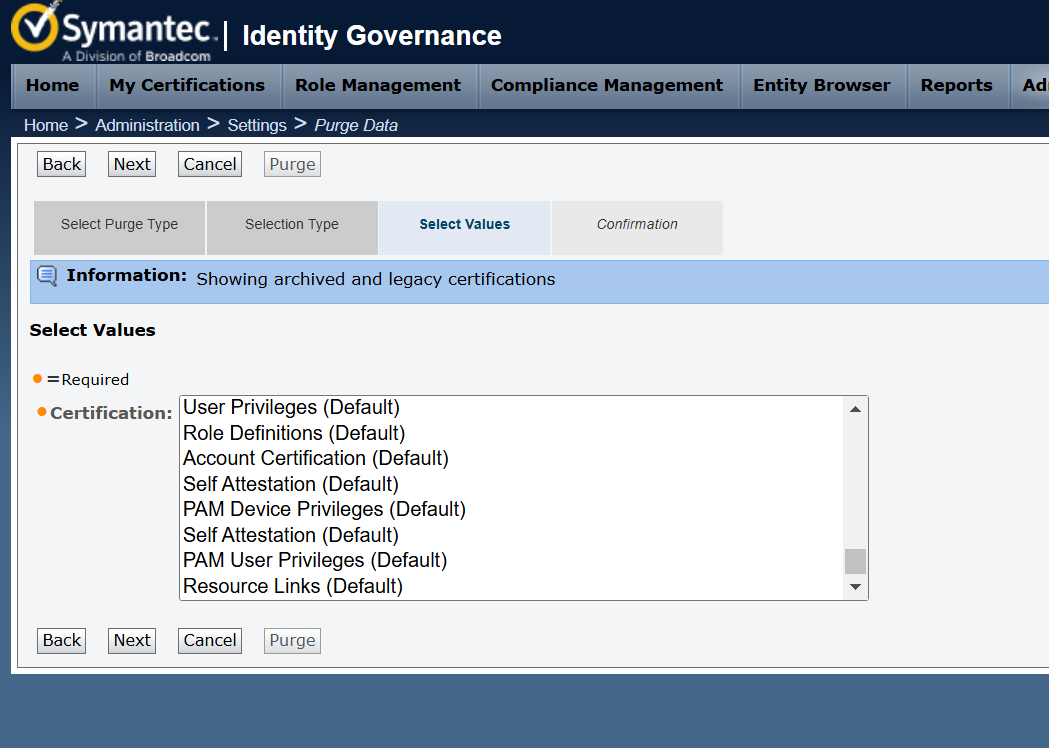 When you try to purge data certification data (Home > Administration > Settings > Purge Data), filtering by Documents > Certification.