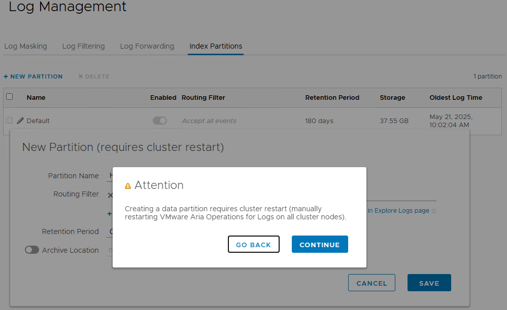 In Aria Operations for Logs, when creating 'NEW PARTITION' under 'Index Partitions', Storage column shows 'N/A' value. See below:
