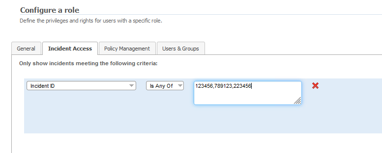 Put each incidentid on a new line and not separated by a comma. Please note that after you save the role, all the incidentid's will be separated by a comma. If you edit this list, you will have to remove all the commas and make sure each incidentid is on a new line.
