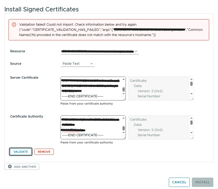 Certificate validation in the SDDC manager fails with the following error: Common Name(CN) provided in the certificate does not match with the resource's hostname.