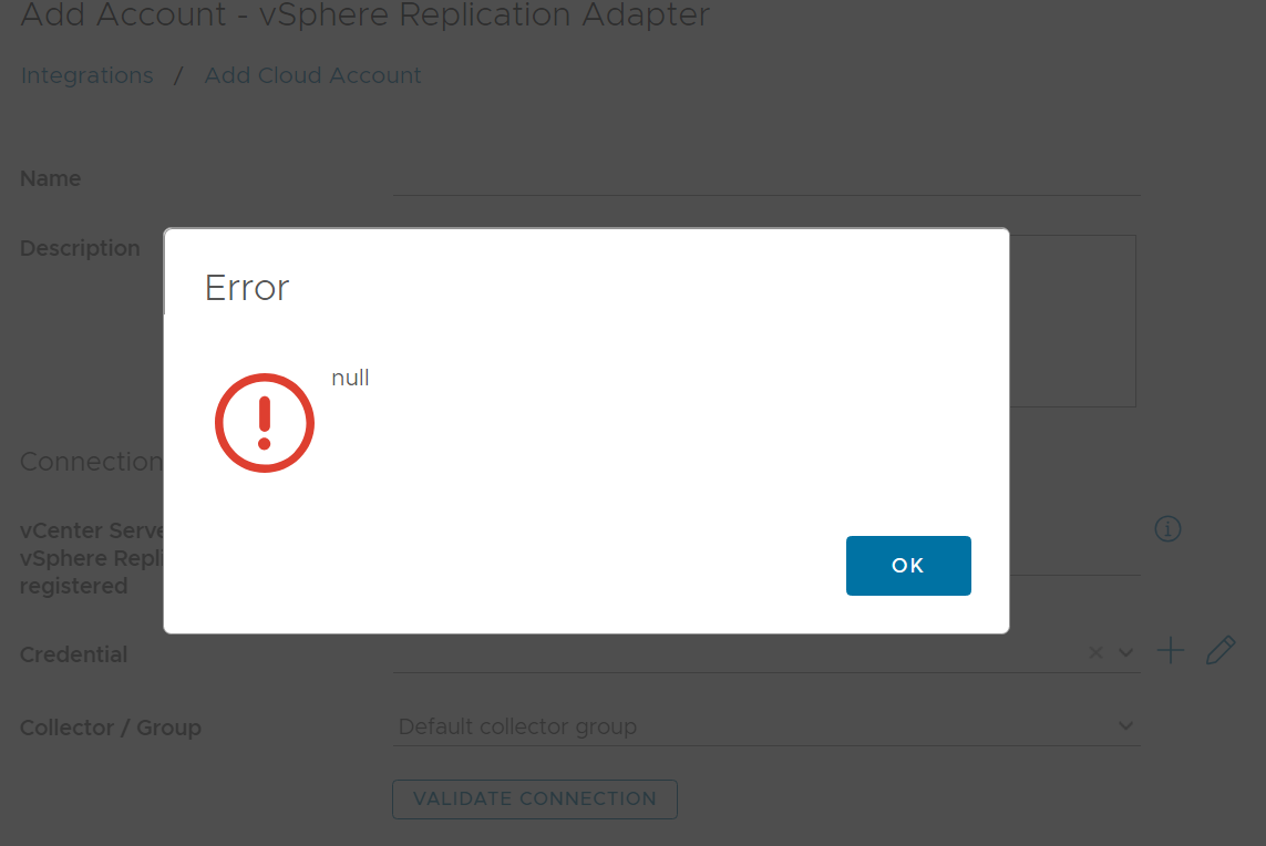 When trying to configure vSphere replication adapter, the following Error is displayed: null