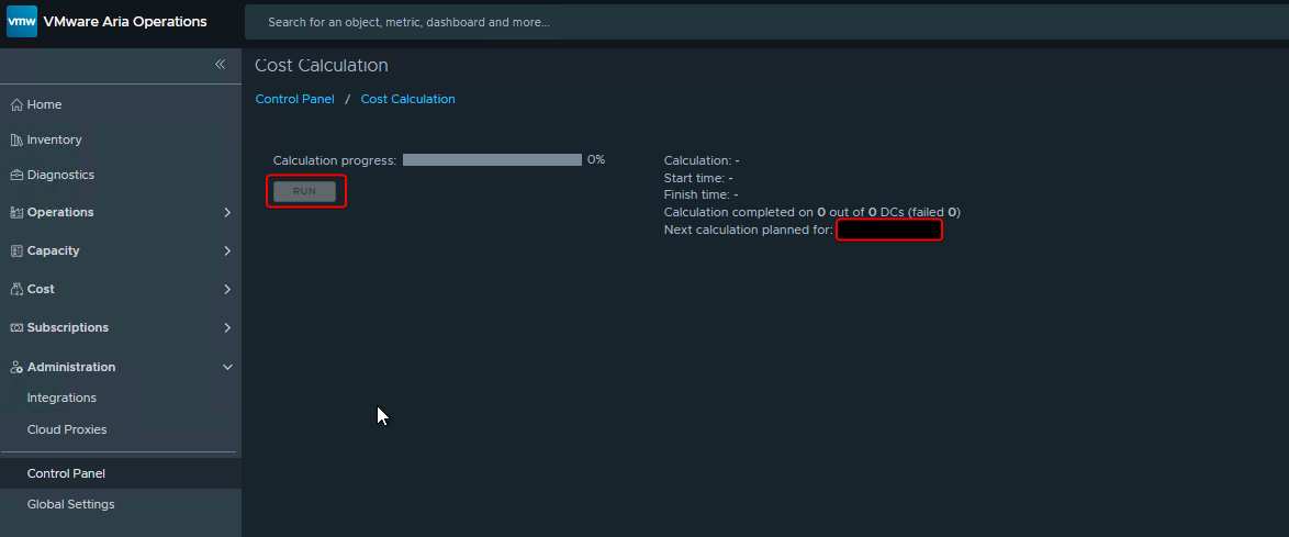 - Login as admin in the https://<Aria_Ops_FQDN>/ui - Expand the Left Panel, Click on Control Panel > Cost Calculation - Manually run the Cost Calculation - Wait for Calculation to complete - After completing the above steps, the mismatch in server count on the Cost Drivers page should be resolved.