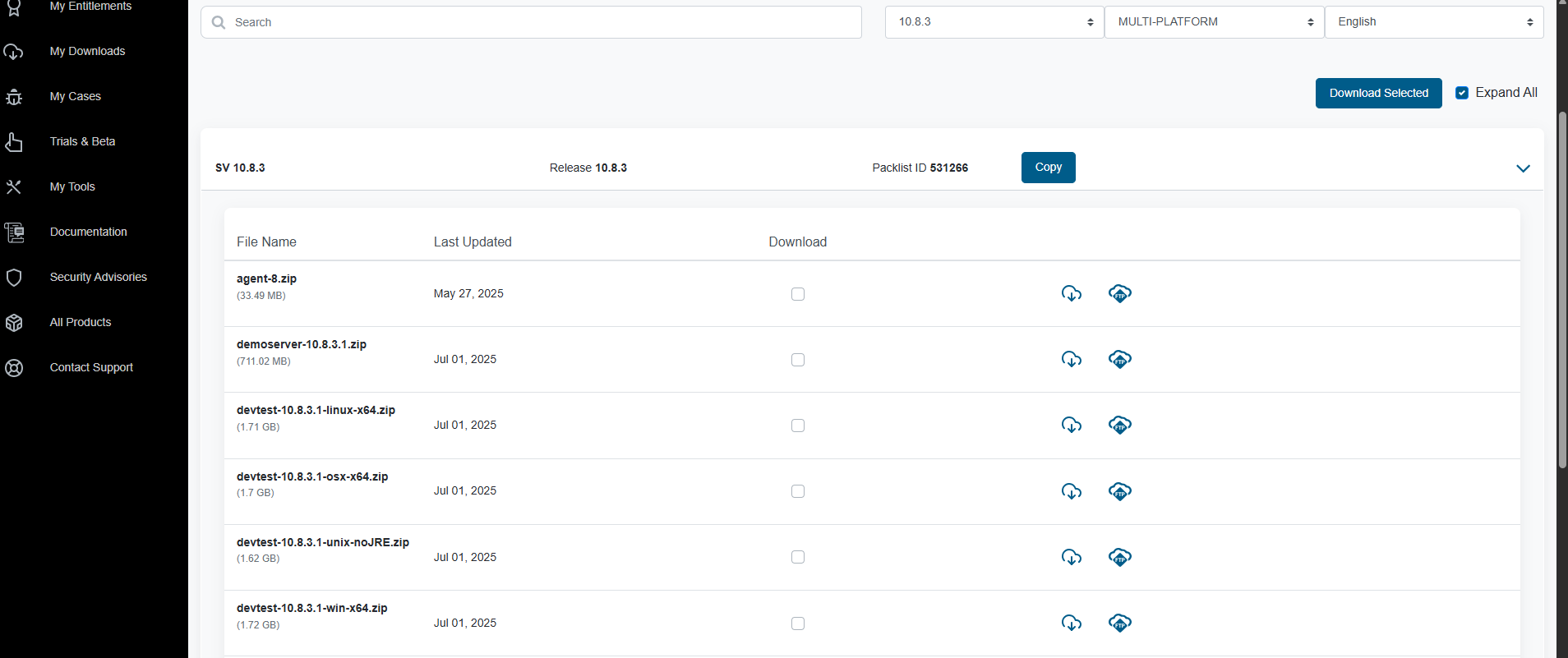 Choose the products you want to download by selecting the Download box and then selecting the Download Selected pushbutton. You also may download each component separately.