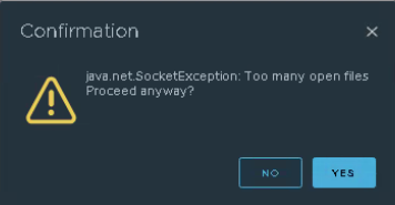 ERROR [TasksManager-TaskHandler-26160] (227277) com.vmware.vcops.vlsi.VcSessions.terminateSession - Cannot Obtain the session: com.vmware.vim.vmomi.client.exception.ConnectionException: https://##.##.##.##/sdk invocation failed with "java.net.SocketException: Too many open files" at com.vmware.vim.vmomi.client.common.impl.ResponseImpl.setError(ResponseImpl.java:265) ~[vlsi-client-8.0.2.jar:?] at com.vmware.vim.vmomi.client.http.impl.HttpExchangeBase.setResponseError(HttpExchangeBase.java:355) ~[vlsi-client-8.0.2.jar:?] at com.vmware.vim.vmomi.client.http.impl.HttpExchange.invokeWithinScope(HttpExchange.java:59) ~[vlsi-client-8.0.2.jar:?] at com.vmware.vim.vmomi.core.tracing.NoopTracer$NoopSpan.runWithinSpanContext(NoopTracer.java:120) ~[vlsi-core-8.0.2.jar:?] at com.vmware.vim.vmomi.client.http.impl.TracingScopedRunnable.run(TracingScopedRunnable.java:17) ~[vlsi-client-8.0.2.jar:?] at com.vmware.vim.vmomi.client.http.impl.HttpExchangeBase.run(HttpExchangeBase.java:54) ~[vlsi-client-8.0.2.jar:?] at com.vmware.vim.vmomi.client.http.impl.HttpProtocolBindingBase.executeRunnable(HttpProtocolBindingBase.java:229) ~[vlsi-client-8.0.2.jar:?] at com.vmware.vim.vmomi.client.http.impl.HttpProtocolBindingImpl.send(HttpProtocolBindingImpl.java:119) ~[vlsi-client-8.0.2.jar:?] at com.vmware.vim.vmomi.client.common.impl.MethodInvocationHandlerImpl$CallExecutor.sendCall(MethodInvocationHandlerImpl.java:693) ~[vlsi-client-8.0.2.jar:?] at com.vmware.vim.vmomi.client.common.impl.MethodInvocationHandlerImpl$CallExecutor.executeCall(MethodInvocationHandlerImpl.java:674) ~[vlsi-client-8.0.2.jar:?] at com.vmware.vim.vmomi.client.common.impl.MethodInvocationHandlerImpl.completeCall(MethodInvocationHandlerImpl.java:371) ~[vlsi-client-8.0.2.jar:?] at com.vmware.vim.vmomi.client.common.impl.MethodInvocationHandlerImpl.invokeFetch(MethodInvocationHandlerImpl.java:347) ~[vlsi-client-8.0.2.jar:?] at com.vmware.vim.vmomi.client.common.impl.MethodInvocationHandlerImpl.invoke(MethodInvocationHandlerImpl.java:191) ~[vlsi-client-8.0.2.jar:?] at com.sun.proxy.$Proxy333.getCurrentSession(Unknown Source) ~[?:?] at com.vmware.vcops.vlsi.VcSessions.terminateSession(VcSessions.java:286) ~[vcops-vlsi-1.0-SNAPSHOT.jar:?] at com.integrien.adapter.vmware.VMwareAdapter.vcDisconnect(VMwareAdapter.java:4440) ~[vmwarevi_adapter3.jar:?] at com.integrien.adapter.vmware.VMwareAdapter.resetVimClient(VMwareAdapter.java:3541) ~[vmwarevi_adapter3.jar:?] at com.integrien.adapter.vmware.drs.ConnectionHelper.resetVimClient(ConnectionHelper.java:94) ~[vmwarevi_adapter3.jar:?] at com.integrien.adapter.vmware.drs.ClusterRulesHandler.stop(ClusterRulesHandler.java:595) ~[vmwarevi_adapter3.jar:?] at com.integrien.adapter.vmware.VMwareAdapter.shutdownDRSRulesManager(VMwareAdapter.java:4662) ~[vmwarevi_adapter3.jar:?]