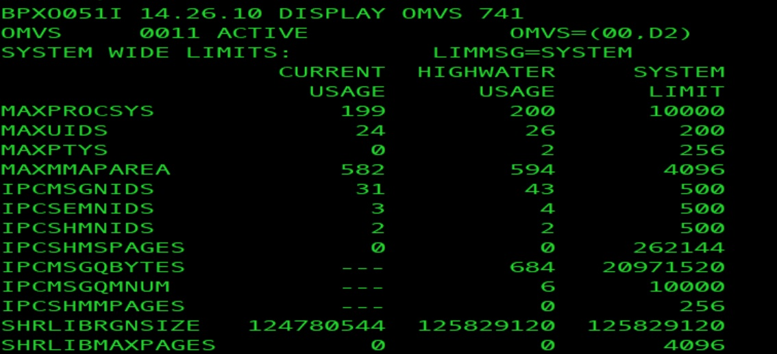 ZWE1AZ 00000010 *BPXI039I SYSTEM LIMIT SHRLIBRGNSIZE HAS REACHED 100% OF ITS CURRENT CAPACITY OF 125829120 ZWESLSTC 00000010 *BPXI039I SYSTEM LIMIT SHRLIBRGNSIZE HAS REACHED 100% OF ITS CURRENT CAPACITY OF 125829120