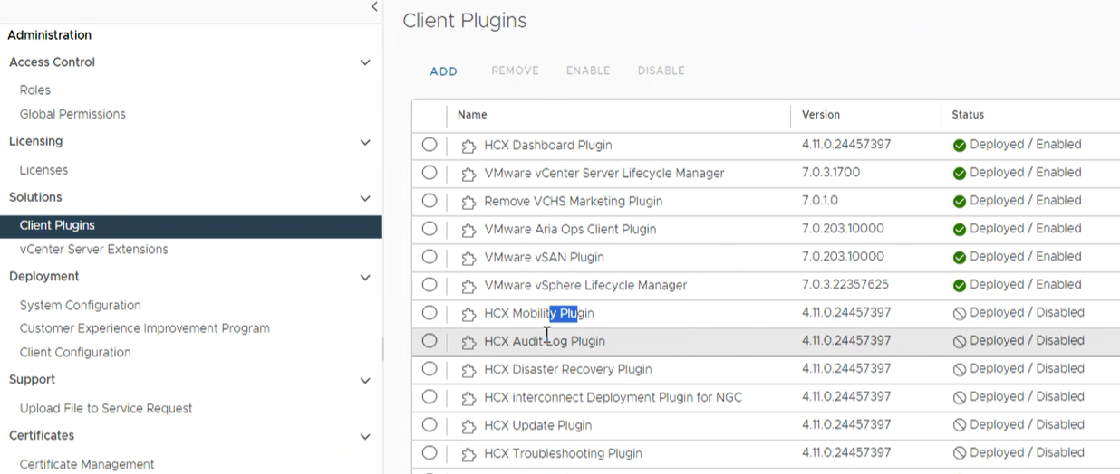 Ensure all HCX Plugin functions are enabled, after the Plugin should appear in the navigation panel