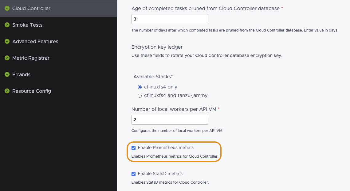 You need to check "Enable Prometheus metrics for Cloud Controller" under TAS tile --> Cloud Controller Tab and Save it. Screen-shot as below -