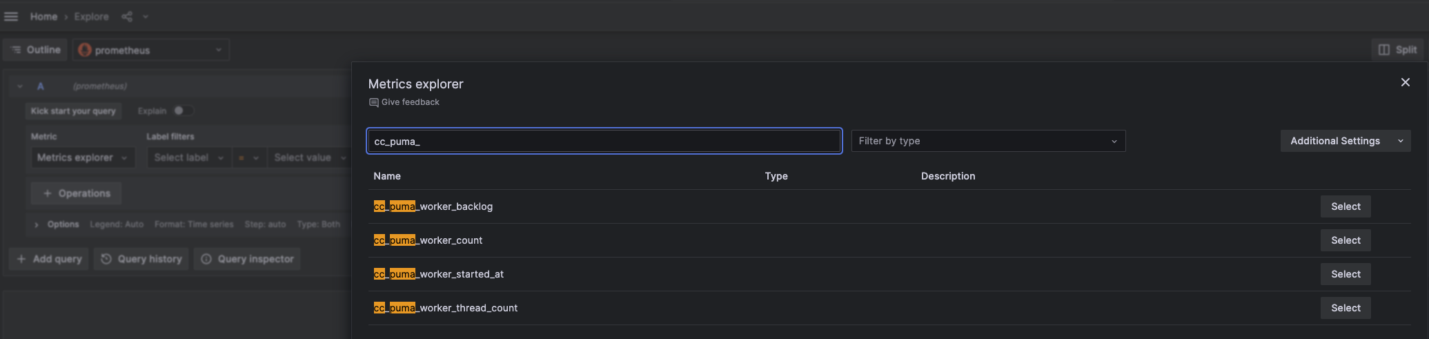 The customer would like to check the cloud controller metrics (refer to doc:https://docs.cloudfoundry.org/running/all_metrics.html#cc) in the Healthwatch Grafana Explore dashboard, but no metrics found. Screen-shot as below: